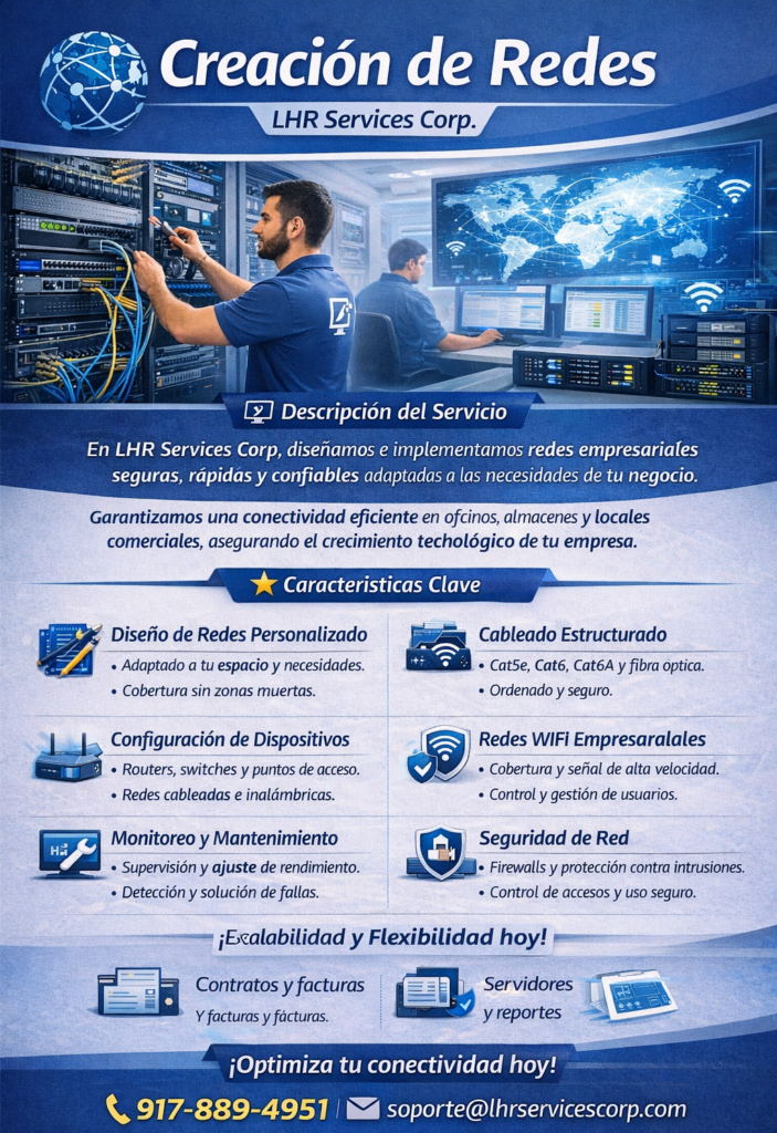 En LHR Services Corp, diseñamos y creamos redes empresariales seguras, rápidas y confiables adaptadas a las necesidades de tu negocio. Nuestro servicio garantiza conectividad eficiente, estabilidad en la comunicación y soporte para el crecimiento tecnológico de tu empresa.