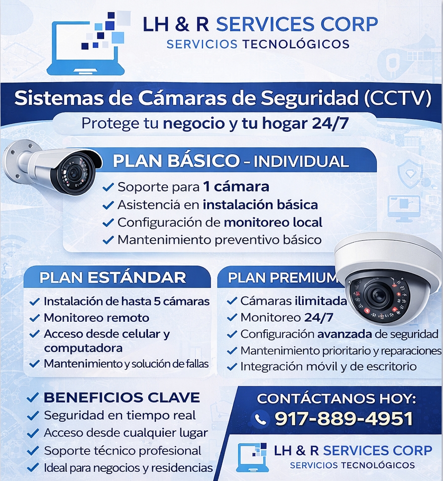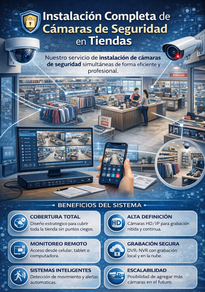Nuestro servicio de instalación de cámaras de seguridad está diseñado para proteger tu tienda, asegurando vigilancia continua, prevención de pérdidas y tranquilidad para tu negocio. Implementamos sistemas modernos que permiten monitoreo en tiempo real, grabación de alta calidad y acceso remoto desde dispositivos móviles, adaptándose a la configuración de tu local.